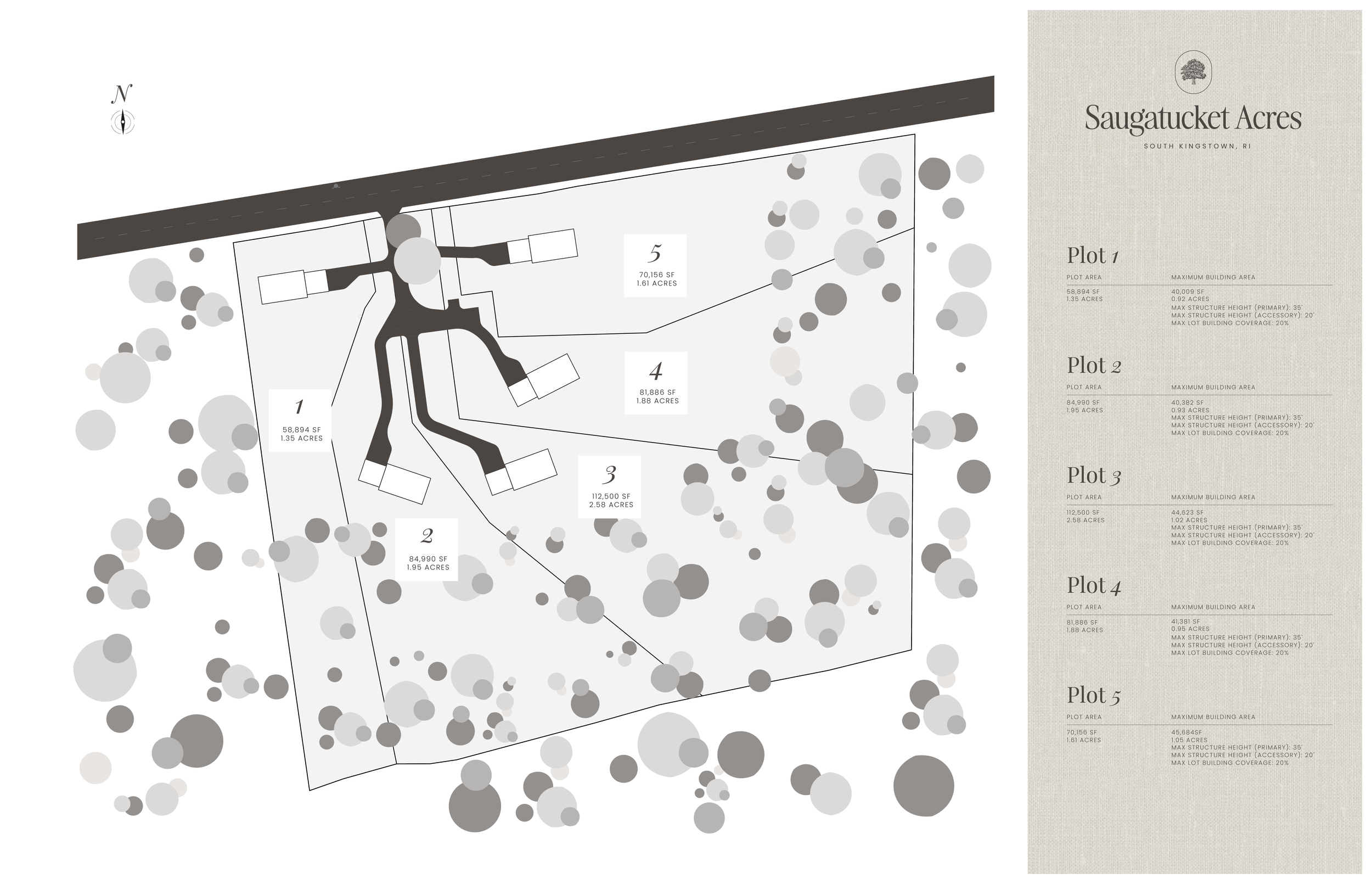 Saugatucket Acres features expansive homesites ranging from 1.35 acres to 2.58 acres, thoughtfully designed to provide space, seclusion, and flexibility. Buyers may bring their own builder or work with the preferred on-site builder to create a custom home tailored to their lifestyle.